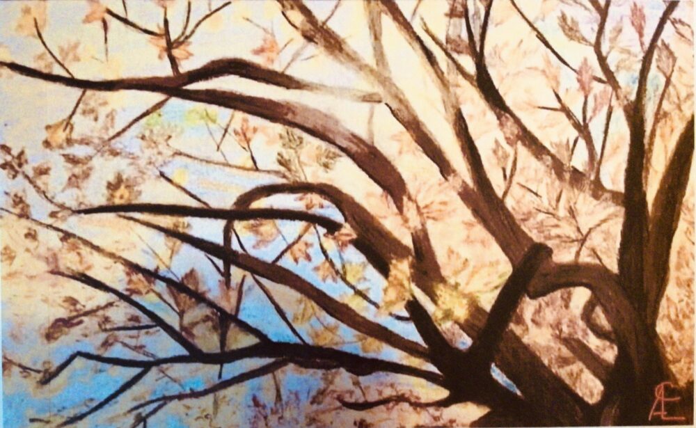 Zwischen den verzweigten Ästen bricht goldenes Licht hervor. Die Sonne gießt ihre Strahlen in sanften Wellen aus und taucht jedes Blatt in flüssiges Gold. Alles wirkt ein wenig träumerisch, fast wie mit Weichzeichner abgemildert. Links unten erscheint der herbstliche Himmel in einem kräftigen Hellblau. Er umarmt sanft das Gold der Blätter und trägt noch die Erinnerung an den vergangenen Sommers in sich.