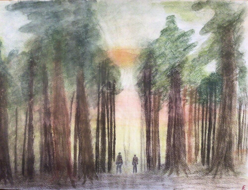 Es zeigt einen stilisierten Wald zum Beginn des Herbst. Die Wipfeln der Bäume sind undurchdringlich miteinander verwoben. Zwei Personen gehen im Gespräch vertieft bei Sonnenaufgang über einen Waldweg spazieren. Der Lichteinfall der Morgensonne gibt dem Bild etwas mystisches aber es strahlt gleichzeitig eine tiefe Ruhe aus.