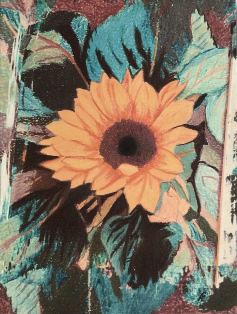 Die Sonnenblume gehört zu meinen Lieblingsmotiven in der Kunst. Ich stelle sie immer wieder gerne mit den unterschiedlichsten Medien dar. Dieses Mal mit Derwent weiche Zeichenstiften und Pastellfarben auf Aquarellpapier. Die Intension die Sonnenblume dieses Mal kraftvoll darzustellen, habe ich mit dem lebendigen, powervollen Hintergrund gelöst. Diese Power des Bildes überträgt sie auf seine Umgebung