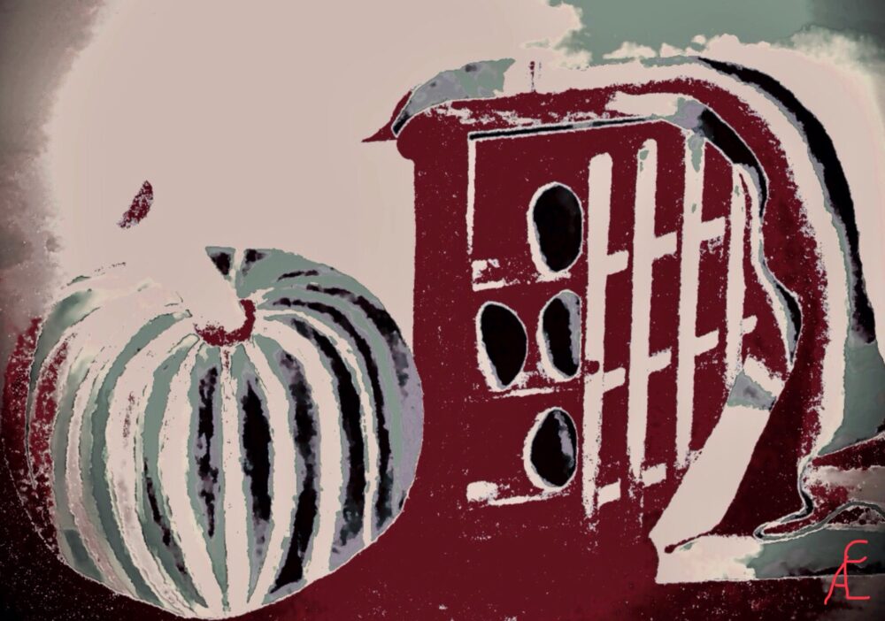Dieses Bild wurde von mir im Pop Art Stil digital gemalt. Die gewählten Farben deuten den Übergang vom Herbst in den Winter an. Der Kürbis wandert vom Feld in die Küche, um dort verarbeitet zu werden.
