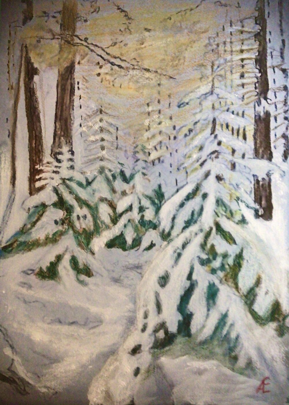 Mein Bild zeigt, passend zur Jahreszeit, den Ausschnitt eines tief verschneiten Waldes im Erzgebirge. Der Tag war zwar sonnig aber die Sonne kommt kaum gegen die Kälte an und scheint nur diffus durch die etwas lichteren Laubbäume.